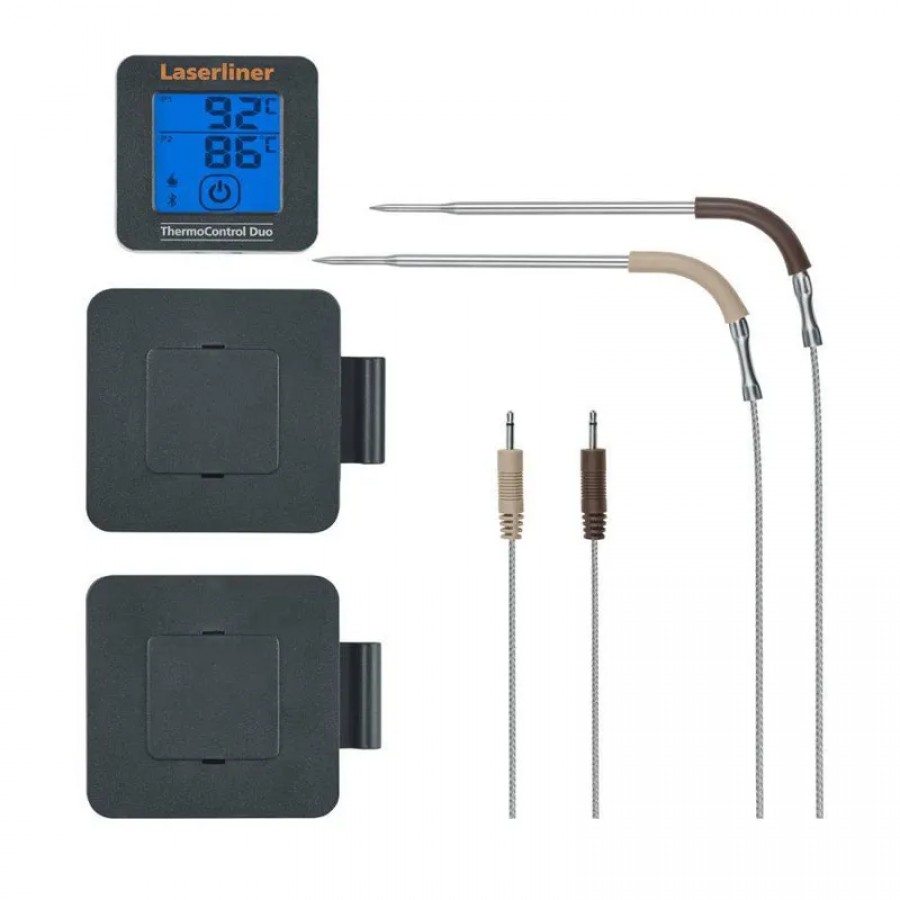 Цифровой термометр позволяет определять уровень приготовления и внутреннюю температуру разных видов мяса, птицы и рыбы. Измерение может производиться одновременно в двух положениях благодаря двум съемным датчикам. Устройство устойчиво к температуре до 350°C и его легко прикрепить к духовке или грилю благодаря сильным магнитам.