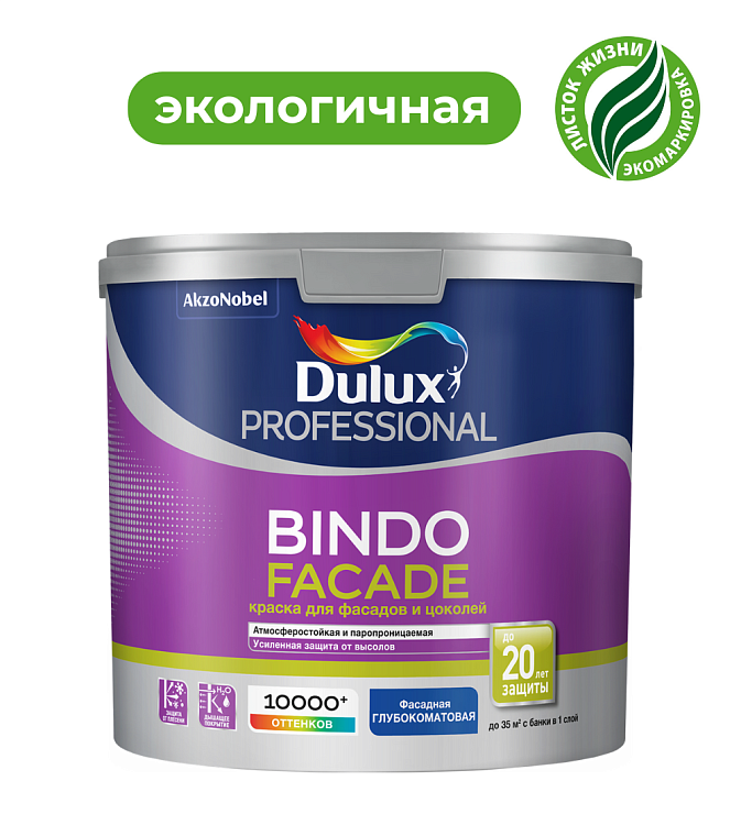Dulux Professional BINDO FACADE - Глубокоматовая водно-дисперсионная краска для высококачественной отделки минеральных фасадных поверхностей и цоколей. Препятствует появлению соли на окрашенной поверхности. Надежно защищает поверхность от проникновения влаги и в то же время пропускает пар изнутри, позволяя покрытию "дышать". Образует абсолютно матовую поверхность, устойчивую к атмосферным осадкам и загрязнениям. Обеспечивает надежную защиту от появления плесени и водорослей. Тиксотропная: наносится без брызг и потеков, легко разравнивается; с нейтральным запахом.