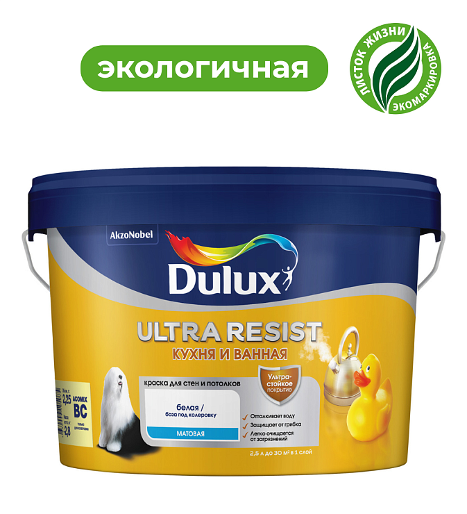 Dulux Ultra Resist кухня и ванная - Ультрастойкая латексная краска на водной основе выдерживает воздействие пара от бытовых приборов (чайника, пароварки) и влаги, защищает поверхность от появления плесени и грибка. Воск в составе создает "эффект лотоса", защищая от образования пятен. Особо прочное покрытие легко моется от загрязнений с использованием чистящих средств. Не имеет резкого запаха, обладает отличной укрывистостью, экономично расходуется, легко наносится без разбрызгивания и потеков. Исключительно износостойкие краски Dulux Ultra resist с технологией Ultra Resist - это 7-кратный запас прочности покрытия ваших стен.*