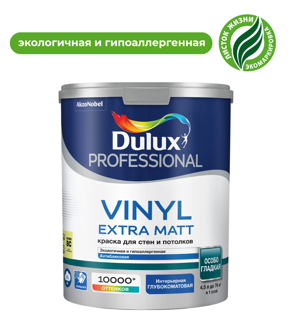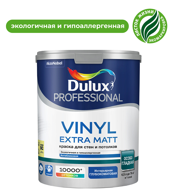 Краска Dulux Vinyl Extra Matt - Глубокоматовая водно-дисперсионная краска для высоко- качественной отделки стен и потолков, максимально укрывистая, с нейтральным запахом. Создает идеально гладкое покрытие.