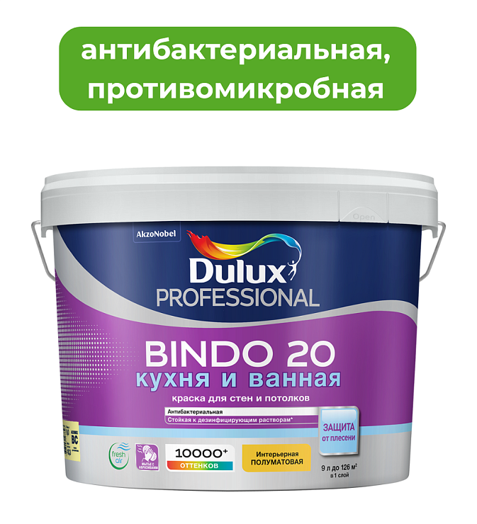 Dulux Bindo 20 кухня и ванная - Полуматовая водно-дисперсионная краска для высококачественной отделки стен и потолков во влажных помещениях, таких как кухни, ванные комнаты, санузлы, прачечные и др., а также помещений с высокими требованиями по гигиене. Покрытие устойчиво к пару от бытовых приборов (пароварка, чайник, отпариватель и т.д.) и конденсату. Тиксотропная: наносится без брызг и потеков, легко разравнивается; с нейтральным запахом.