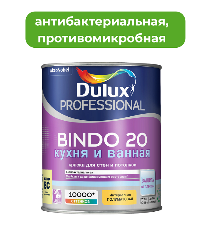 Dulux Bindo 20 кухня и ванная - Полуматовая водно-дисперсионная краска для высококачественной отделки стен и потолков во влажных помещениях, таких как кухни, ванные комнаты, санузлы, прачечные и др., а также помещений с высокими требованиями по гигиене. Покрытие устойчиво к пару от бытовых приборов (пароварка, чайник, отпариватель и т.д.) и конденсату. Тиксотропная: наносится без брызг и потеков, легко разравнивается; с нейтральным запахом.