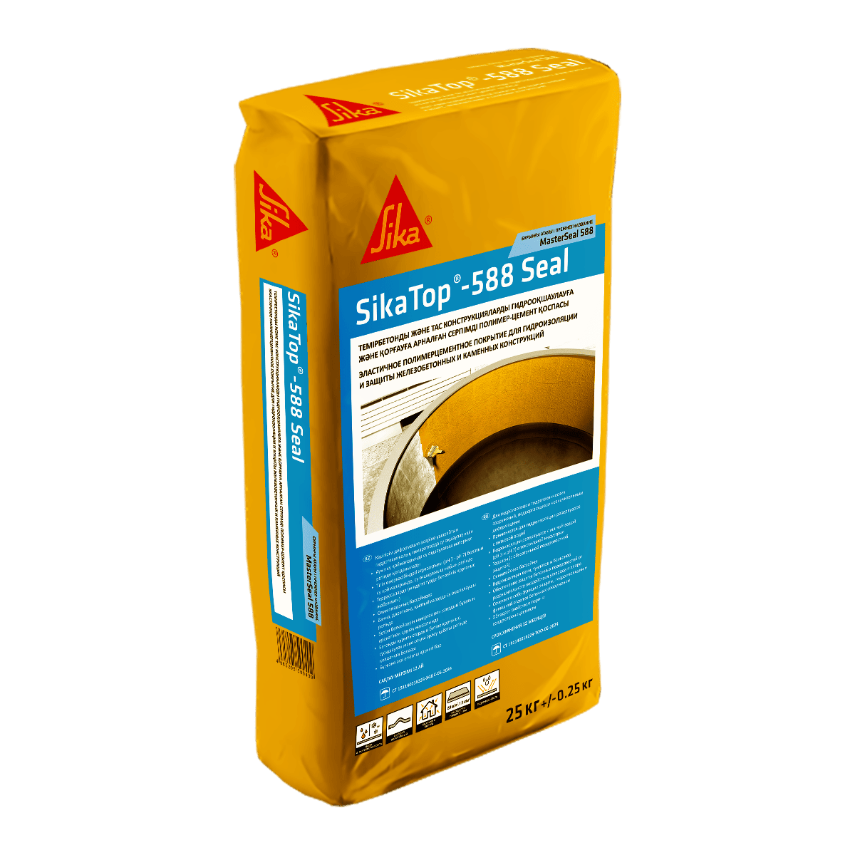 SikaTop-588 Seal (MasterSeal 588) – готовый к применению двухкомпонентный состав для гидроизоляции и вторичной защиты строительных конструкций. Сухой компонент, представляет собой смесь портландцементов, модифицирующих добавок и полимерной фибры. Жидкий компонент состоит из акриловой полимерной эмульсии в воде. При смешивании двух компонентов образуется пластичный (сметанообразный) легконаносимый состав. SikaTop-588 Seal наносится на поверхность щеткой, валиком или штукатурным распылителем и после высыхания представляет собой высокоэластичное покрытие, обеспечивающее надежную защиту и гидроизоляцию сооружения.