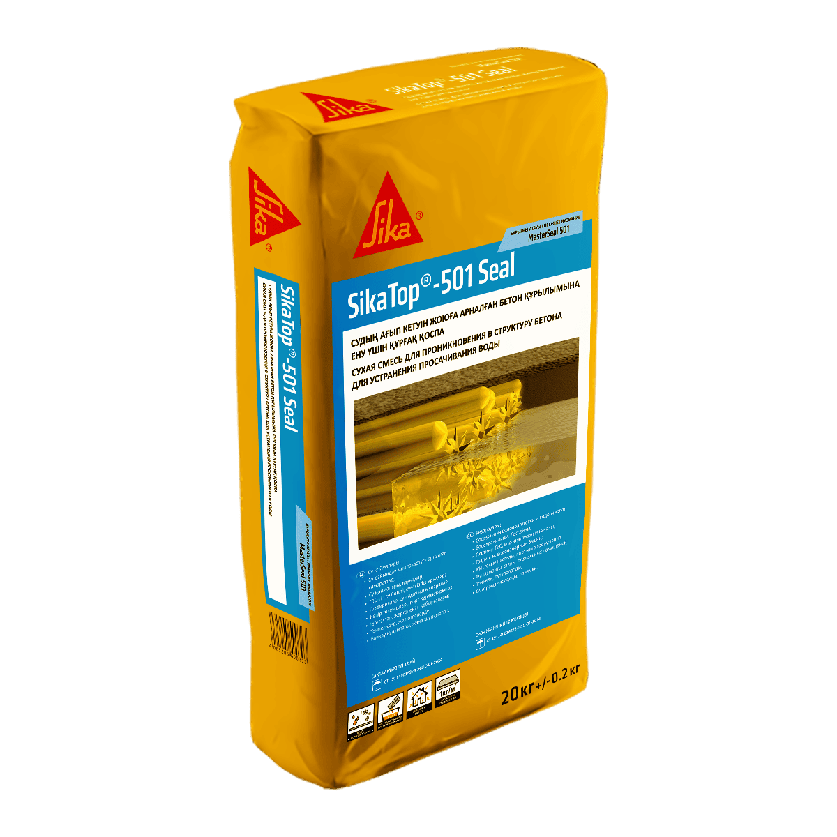 SikaTop-501 Seal (MasterSeal 501) - готовая к применению сухая смесь, в состав которой входят специальные цементы, фракционированный заполнитель, органические добавки и химически активные вещества, способные к кристаллизации в порах обработанного бетона. Состав предназначен для гидроизоляции и устранения просачивания воды через бетонные конструкции. Эффект уплотнения структуры бетона достигается за счет роста труднорастворимых кристаллов в заполненных жидкостью капиллярах и порах в зоне обработанного бетона, что препятствует переносу жидкости через них. MasterSeal 501 предназначен для нанесения на подготовленную бетонную поверхность в качестве раствора либо в качестве сухой смеси посредством просыпки для дополнительной гидроизоляции строительных швов.