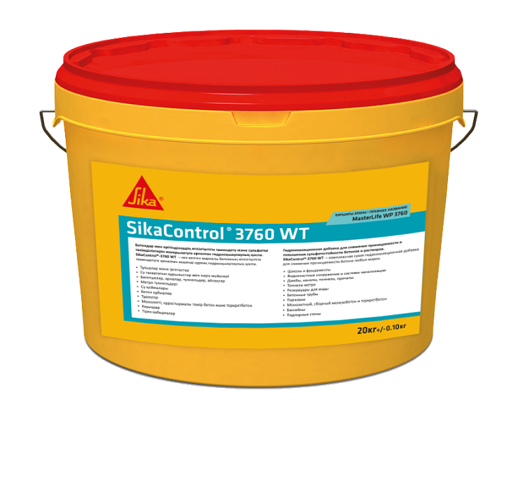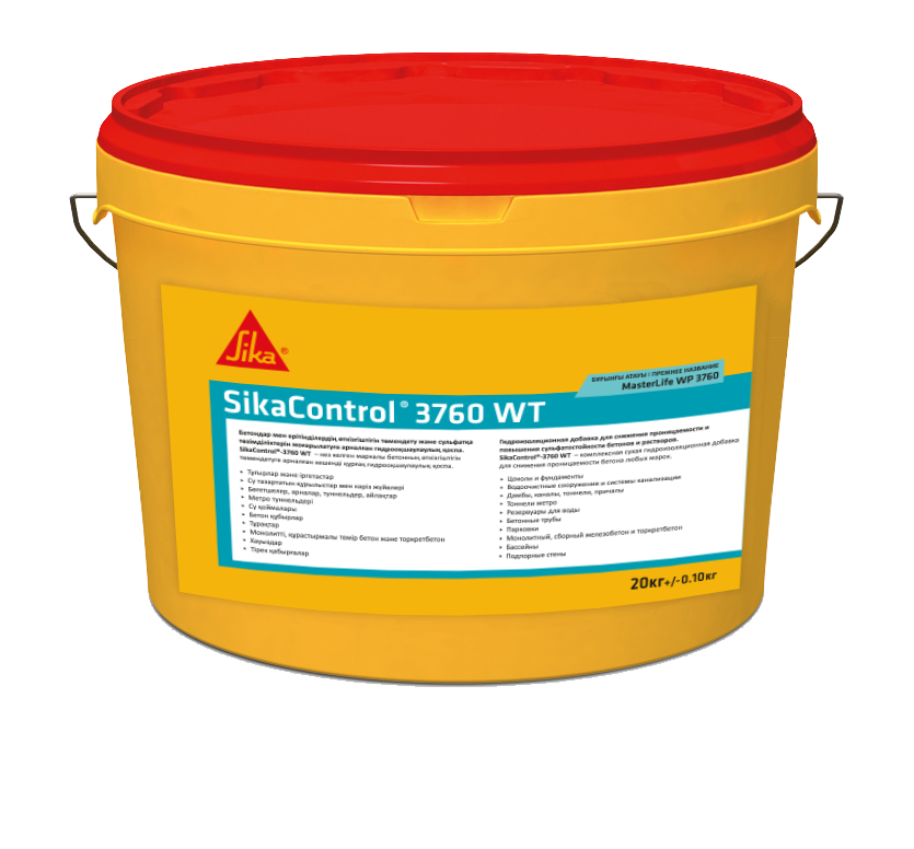 SikaControl®-3760 WT (MasterLife® WP 3760) состоит из портландцемента, тонкомолотого кварцевого песка и различных специальных добавок. Компоненты добавки вступают в реакцию с водой и продуктами гидратации цемента с образованием нерастворимых соединений в порах и капиллярах бетона. Повышает водонепроницаемость и коррозионную стойкость бетонов и растворов по отношению к сульфатной агрессии, что дает возможность производства сульфатостойких бетонов на общестроительном цементе. В условиях влажной среды и постоянного контакта бетона с водой SikaControl®-3760 WT (MasterLife® WP 3760) обладает свойством залечивания трещин шириной раскрытия до 0,4 мм.