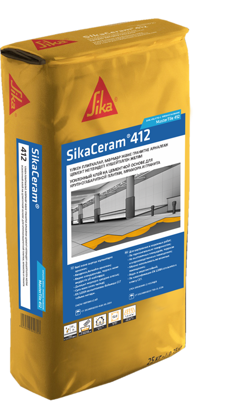 SikaCeram 412 (MasterTile 412) – Цементный клей, обладающий высокой фиксацией, на цементной основе для укладки крупногабаритной плитки, мрамора, керамогранита на горизонтальной поверхности. Легок в приготовлении и нанесении.