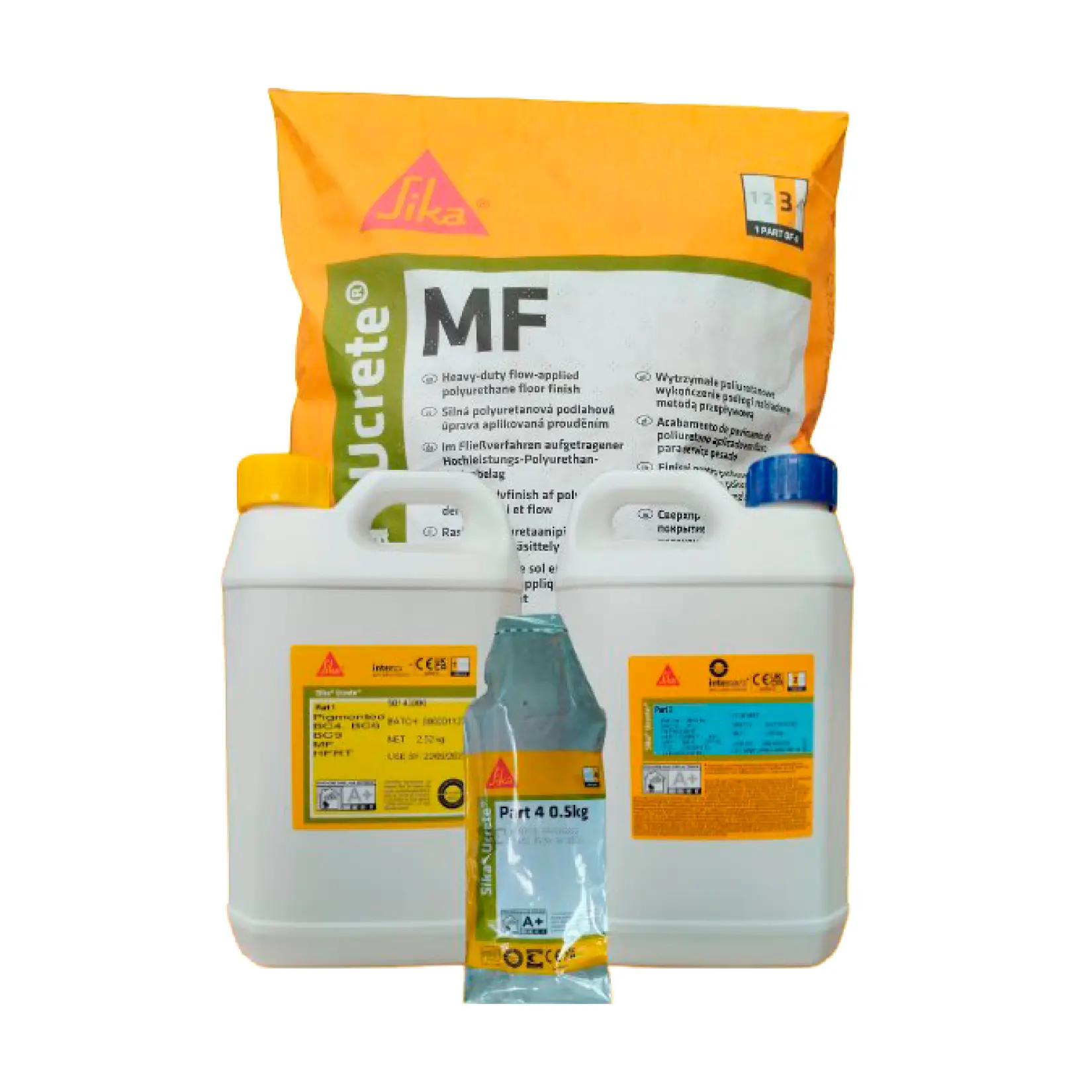 Массовое соотношение частей -Компонент «Part 1» (полиуретановая основа) - Компонент «Part 2» (отвердитель) -Компонент «Part 3» (сухая смесь) -Компонент «Part 4» (жидкий пигмент) - Канистра 2,52 кг Канистра 2,86 кг Мешок 14,40 кг Полиэтиленовый пакет 0,5 кг