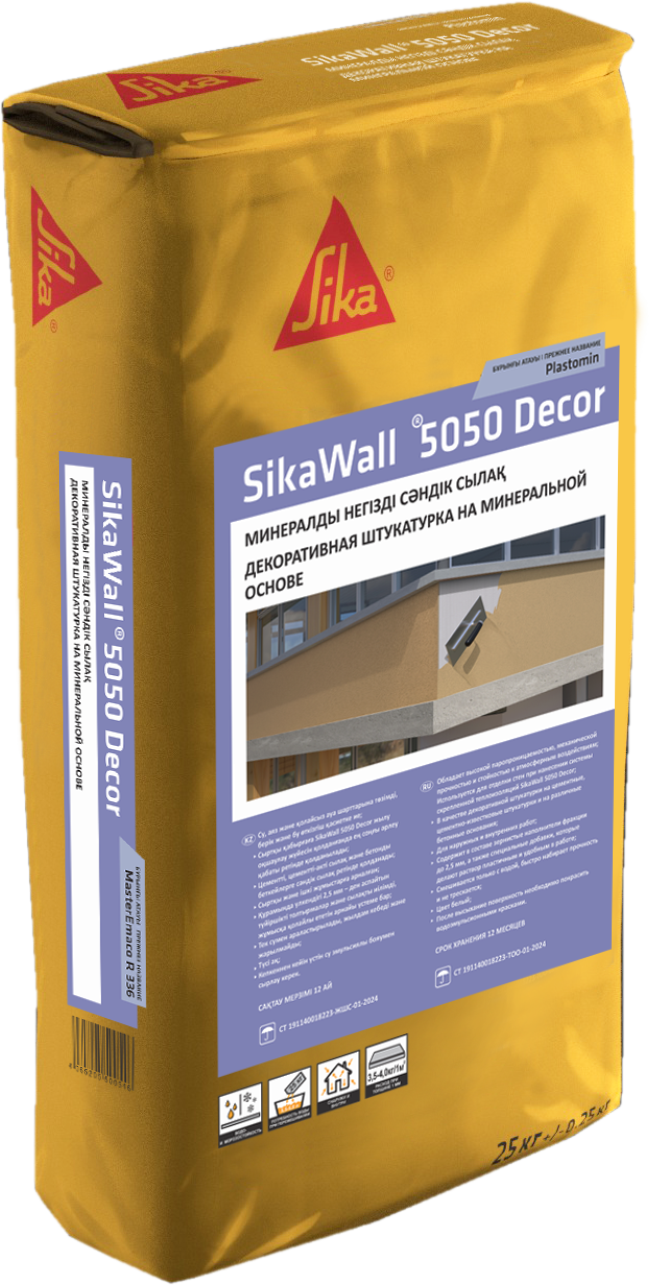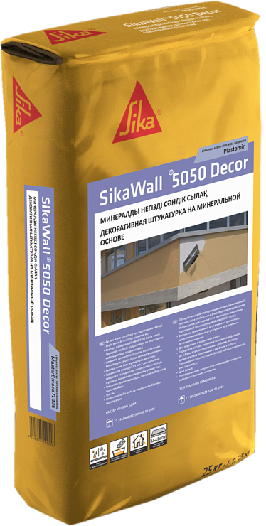 Декоративная минеральная штукатурка SikaWall 5050 Decor изготовлена на основе белого цемента, извести, и содержит в составе зернистые на-полнители крупностью фракции до 2,5 мм, а также специальные добавки, которые делают раствор пластичной и удобной в работе, она отличается хорошей адгезией с основанием. Содержание специальных микроволокон дополнительно укрепляет структуру штукатурки. Фасадная минеральная штукатурка SikaWall 5050 Decor содержит гидрофобные соединения, которые задерживают воду на поверхности штука-турки и делают ее устойчивой к смыванию.